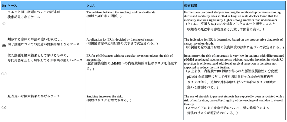 (i)のようにドキュメント中からクエリと同じ話題を検索可能なケースがあることが確認できた。また、(ii)のように類似する意味の単語であれば(Application と Indication、decide と determine など)、その違いを吸収して同じ話題を扱う文が検索可能なケースがあることが確認できた。以上の結果は、ある程度柔軟性のある検索が可能であることを示しており、RoBERTa により論文にまつわる文書処理の効率化が可能なことを示唆する結果である。