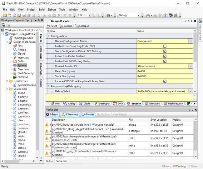 - 画面左 Workspace Explorerペインの System をダブルクリックしてシステム設定を表示します。 (表示されていない場合は、Project > Design Wide Resource 下にあるので、順に展開する)中央ペインのHeapSizeを0x400に書き換えます。