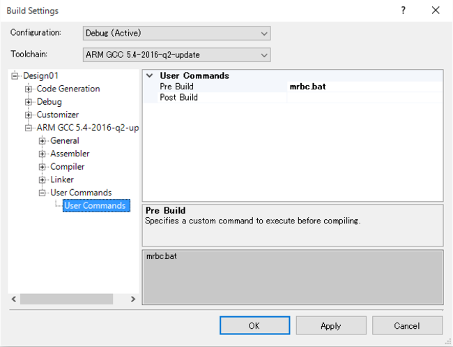 ARMGCC... >User Commands>User Commandsの設定欄Pre Buildへ mrbc.batを入力します。